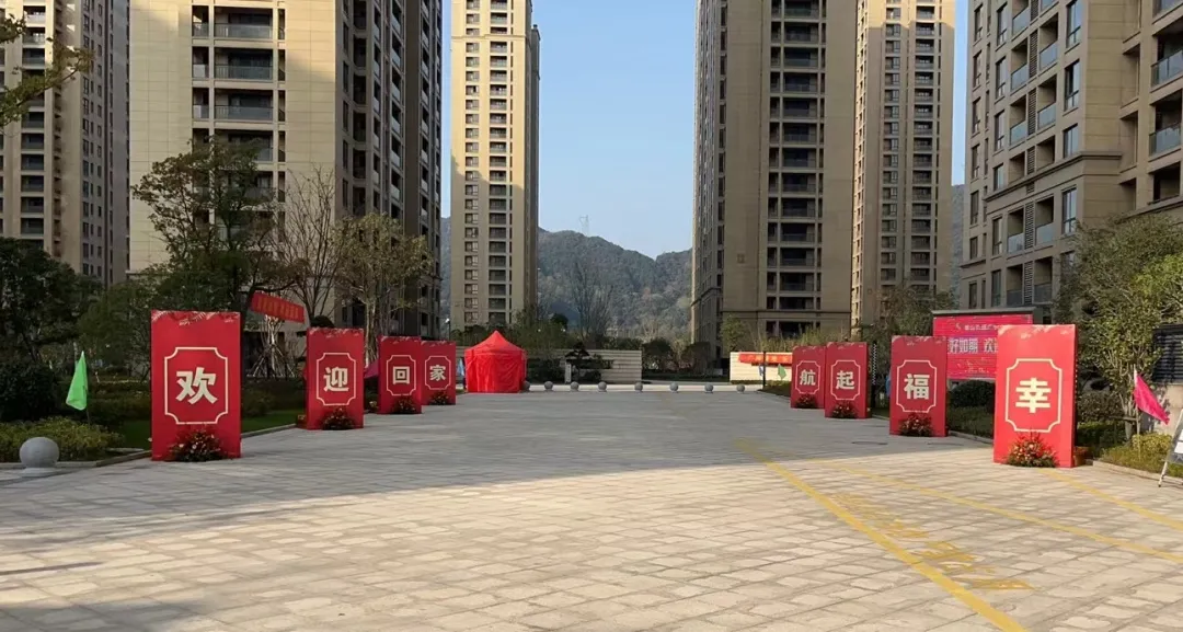 廣樂公寓交房現場,紅色拱門喜氣洋洋,遍布小區的“歡迎回家”的標語讓人倍感親切。
