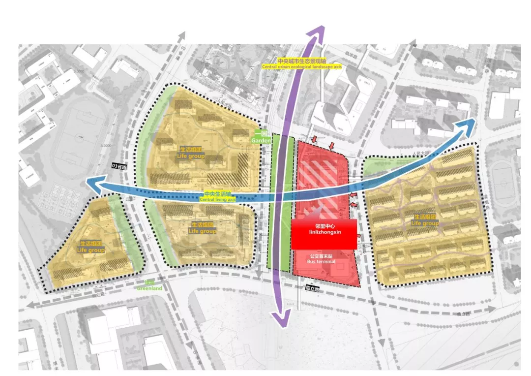 以鄰里中心為核心,結合社區鄉愁文化公園串聯整個地塊,基于當地實際情況,圍繞本地居民、新城居民、引進人才的生活需求,合理規劃社區格局,打造“小街區,密路網”交通格局,結合慢性系統,實現社區便利10分鐘生活圈,建設集文創、鄰里、服務為一體的浦南未來社區新家園。