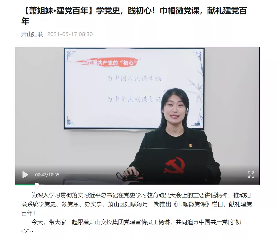 認真貫徹集團黨委和區婦聯的各項指示精神,制定2021年“巾幗心向黨·奮斗新征程”黨史學習教育計劃。參加全區“建黨百年路·建功亞運城”亞運知識競賽;配合區婦聯錄制“巾幗向陽花.微黨課”講解黨史故事視頻;開展“百個故事講黨史·百封家書頌黨恩”活動,提交區婦聯2個音頻作品;安排20位女職工參加區婦聯組織“守初心·學黨史”主題宣講教育活動;參加區婦聯組織的年度家庭教育指導干部培訓班。