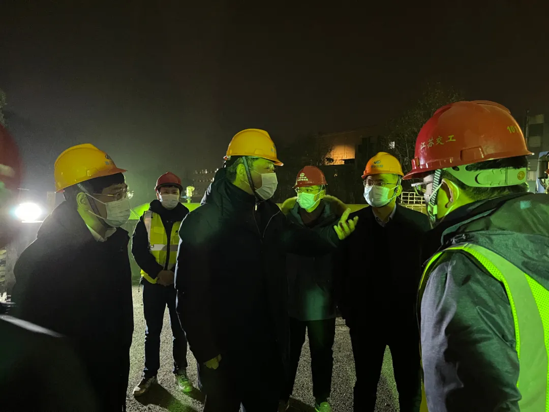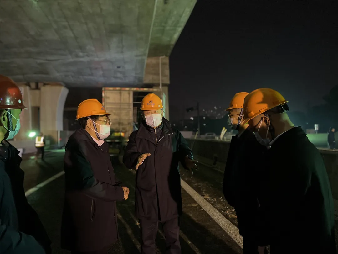 方軍一行來到03省道東復線高架南延工程——北塘河橋面工程現場,實地查看該節點施工進度,詳細了解夜間施工人員和機械設備投入情況。