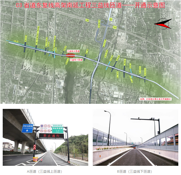 2022年4月29日(周五)上午10時起,03省道東復線高架南延工程三益線上下匝道開通試運行,同時地面道路三益線(塘新線至新街鎮人民路段)將恢復通行,標志著03東復線高架南延工程建設范圍內道路已經全線通車。
