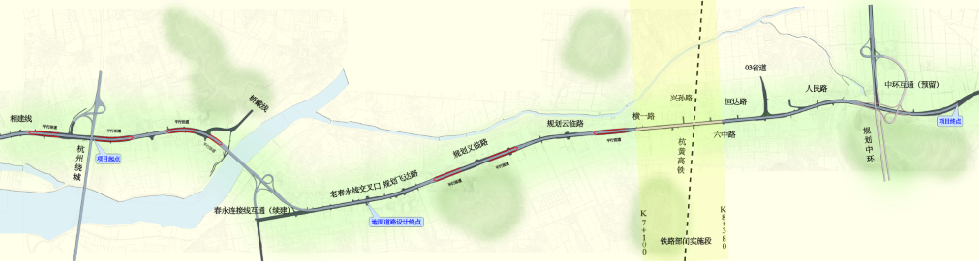 時代大道南延項目位于杭州市蕭山區(qū),起點為聞戴公路與繞城公路交叉口以南約60米處沿線往南跨過浦陽江,經過義橋鎮(zhèn)、戴村鎮(zhèn),終點至聞戴公路與規(guī)劃城市中環(huán)線交叉處以南約1公里處。項目采用高架+地面道路形式,主線高架全長約11.2公里,地面道路建設里程約3.87公里。
