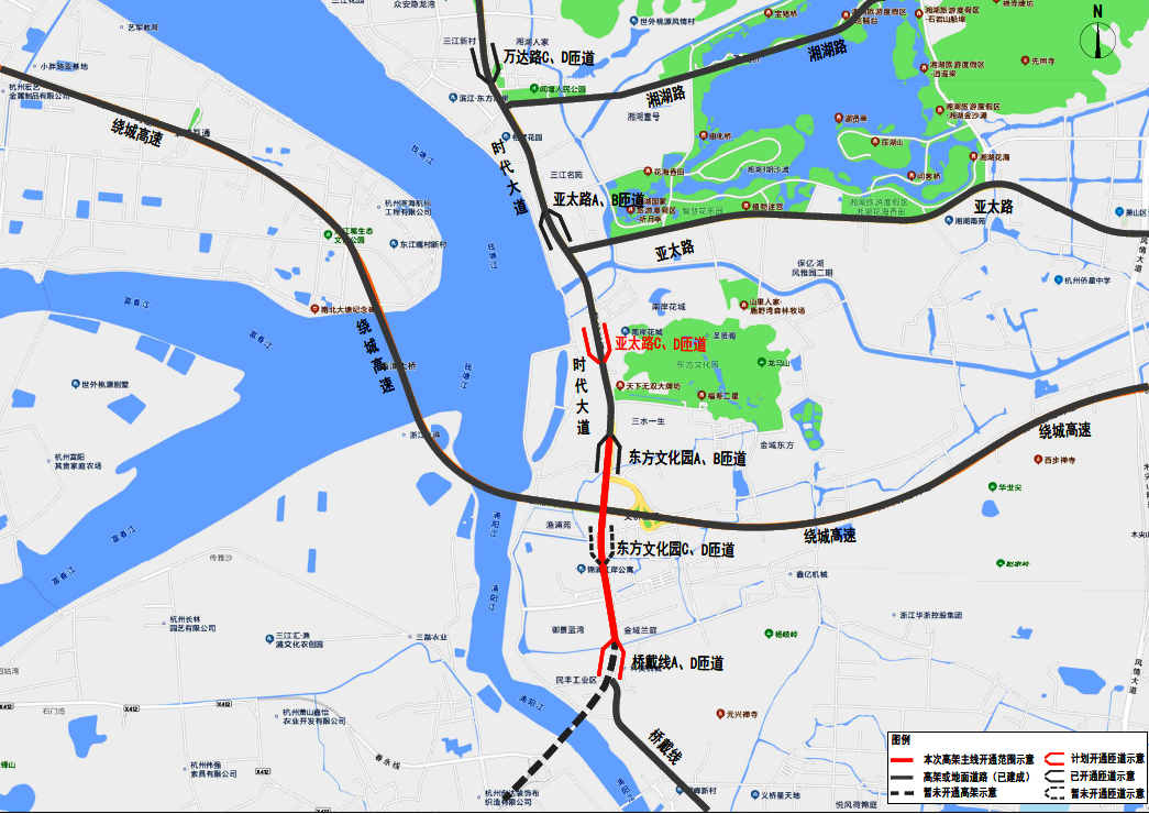 時(shí)代大道改建工程通車段為亞太路C、D匝道及主線高架剩余0.82千米路段,其中:由南往北(義橋往杭州方向)可通過亞太路D匝道從主線高架下橋,進(jìn)入地面向北通行;由北往南(杭州向義橋方向)可通過亞太路C匝道進(jìn)入主線高架向南通行,全程約0.8公里。