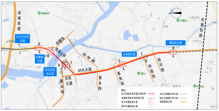 2022年9月5日上午10時(shí),時(shí)代大道南延(繞城至中環(huán)段)工程橋戴線-戴臨路段高架橋開通試運(yùn)行,同步開通橋戴線互通B、C匝道、春永連接線互通(上、下行)匝道、義臨路互通A、D匝道、戴臨路互通A、B匝道,本次開通高架主線里程共5.75公里。