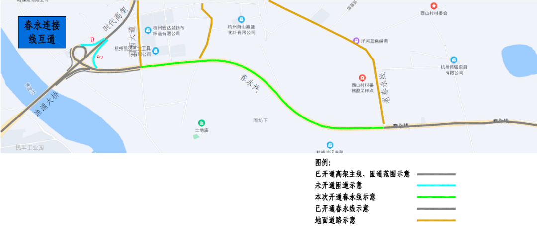 西向南(富陽(yáng)往戴村方向)可通過(guò)春永連接線右轉(zhuǎn)進(jìn)入河西大道地面道路向南通行。