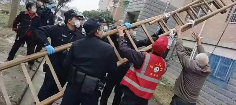 物業保安員施杏榮和陳校慶聽到消息后,第一時間趕到了現場,兩人在輪換嘗試多次后,也未能將門打開。9:43警察同志趕到現場,在一番確認后,警察同志一時間也束手無策,只能尋找開鎖師傅進行開鎖,但現場情況十分緊急,等開鎖師傅到來,可能事故已經發生。在短暫商討過后,物業工作人員迅速跑去抬登梯,取得登梯后綠化師傅孫建松迅速爬上防盜窗,在業主、警察同志和物業工作人員的齊心協力下成功化解了此次危機。