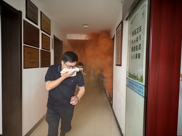 最后由安全營運部負責人韓利明組織在辦公場所內投擲煙霧彈,頓時煙霧繚繞,全體職工在面對突發事件臨危不亂、沉著冷靜,全員采取了正確的逃生姿勢,整個過程組織嚴密,疏散有序,逃生演練取得了圓滿成功。