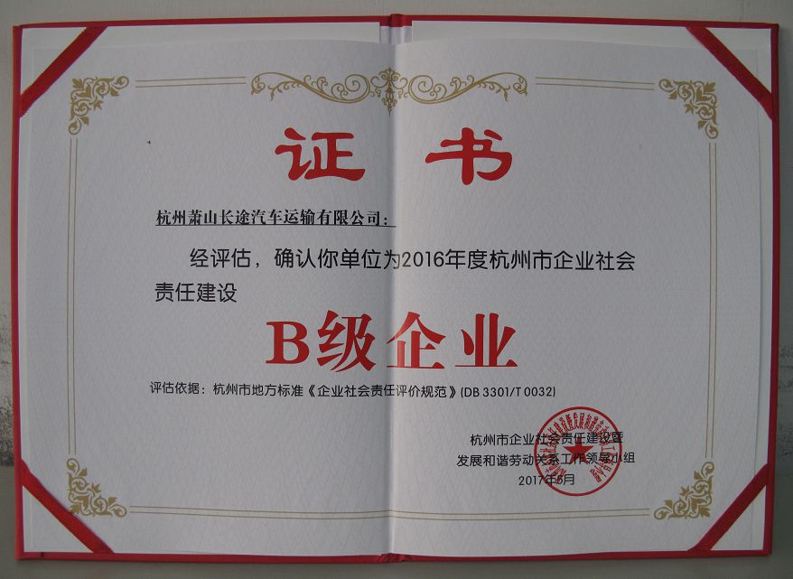 長運公司榮獲2016年度杭州市企業社會責任建設B級企業!