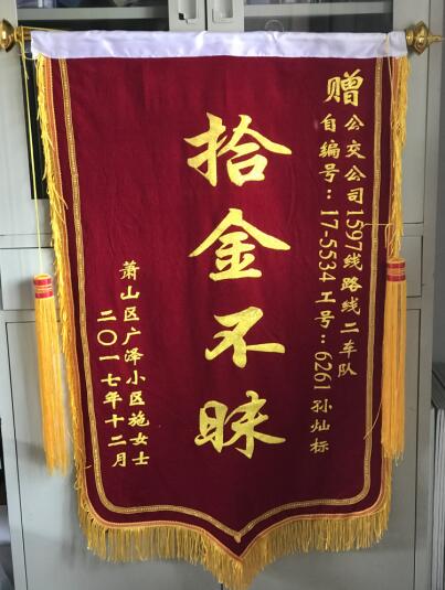 12月10日,市民施女士來到蕭山公交二車隊(duì)送錦旗。錦旗上寫著四個(gè)閃閃發(fā)光的大字:“拾金不昧”,感謝公交公司1597線路的孫燦標(biāo)師傅拾金不昧的精神。