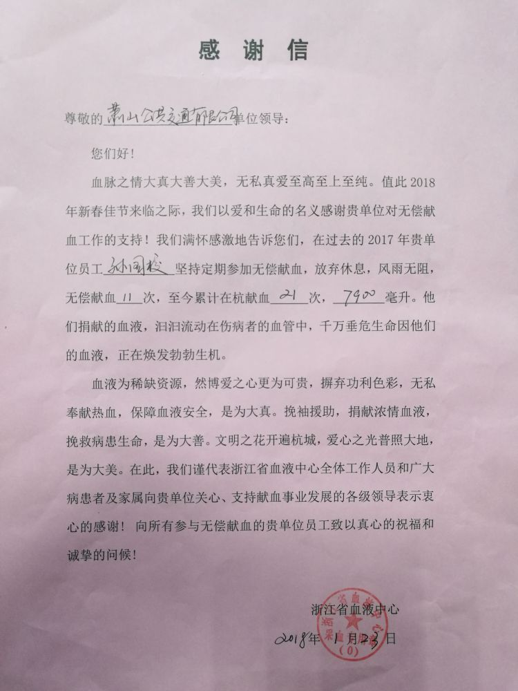 同時(shí),信中特別提到了孫國校師傅,過去的2017年,孫師傅定期參加無償獻(xiàn)血,放棄休息,風(fēng)雨無阻,無償獻(xiàn)血11次,至今在杭累計(jì)無償獻(xiàn)血21次,7900毫升,他的善舉為挽救眾多垂危的生命至關(guān)重要,向?qū)O師傅致以崇高的敬意和感謝。