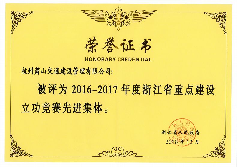 2018年,杭州蕭山交通建設管理有限公司被浙江省人民政府評為2016-2017年度浙江省重點建設立功競賽先進集體。