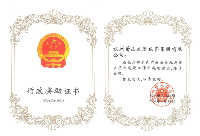 2024年10月 蕭山交投集團榮獲2023年杭州市擴大有效投資推進重點項目建設優秀單位稱號